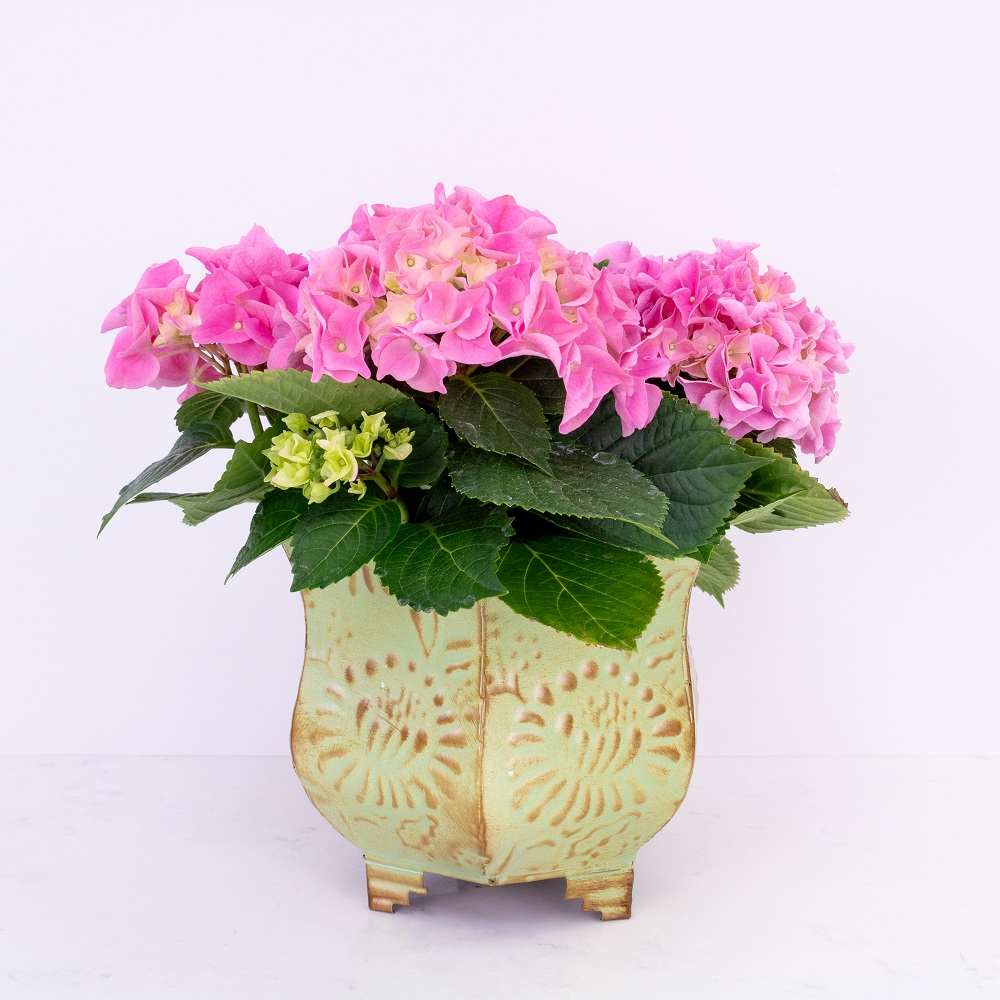 5″ Hydrangea housed in a textured metal planter. Flower and container color as shown may vary depending upon availability.