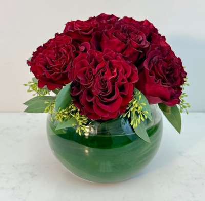 These heart garden roses are a deeper red and arranged with seeded eucalyptus and aspidistra leaves in an 8″ glass bowl vase.