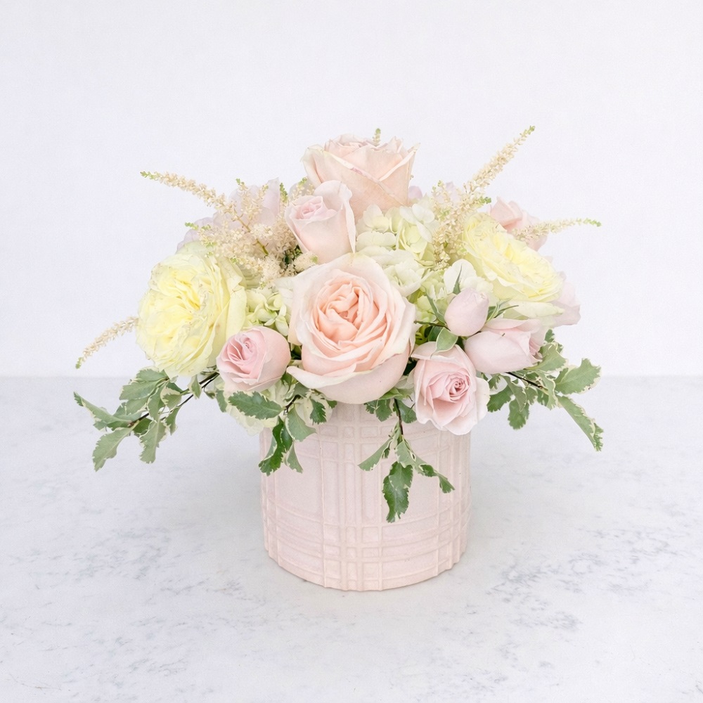 This delicate mounded arrangement is comprised of roses, hydrangeas, and astilbe in soft pinks and cream, nestled in a blush textured cylinder.