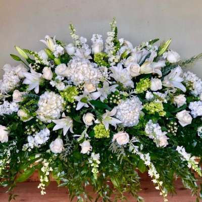 A large and elegant green and white casket arrangement with larkspur, snapdragons, stock, both green and white hydrangea, hypericum berries, roses, tuberoses, lilies, double lilies, mixed greenery.