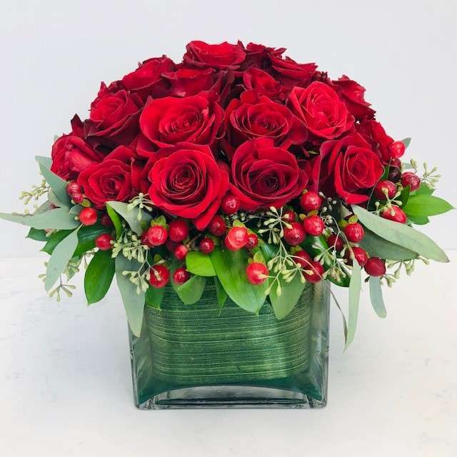 This arrangement comes with your choice of beautifully mounded roses, hypericum berries, seeded eucalyptus and Israeli ruscus in a glass cube vase. As roses come in many colors, please specify your primary and secondary rose color preferences in the space provided below.