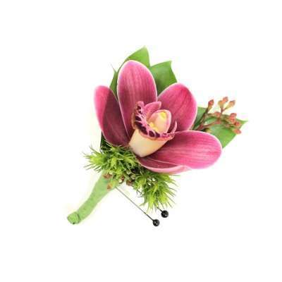 This charming boutonniere is created using a single mini cymbidium bloom with seasonal greenery. We offer a variety of colors from which to choose. Please specify your primary and secondary color preferences in the space provided below.