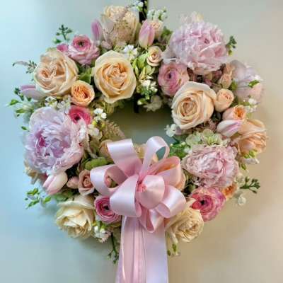 This door wreath is filled with flowers and can be a variety of pinks for a girl (shown) or blue flowers for a boy, both with a satin ribbon bow.