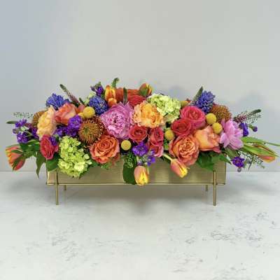 This rectangular brass container is filled with many varieties and colorful blooms. If there are specific flowers shown that are out of season our designers will substitute those with something of similar color.