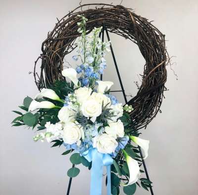 This wreath is 18″ can be arranged for either a new baby girl as shown with pink and white flowers or for a boy with blue and white flowers.