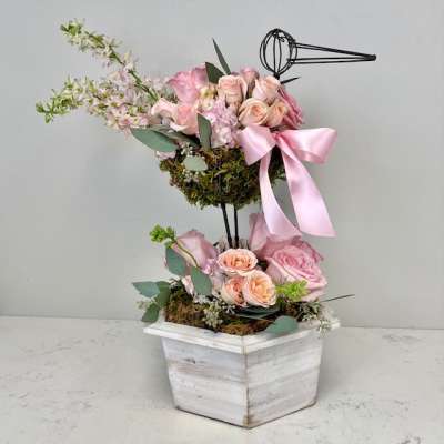This arrangement contains hydrangea, larkspur, both garden and spray roses and mixed greenery with a wire framed stork, mounted into a white washed wooden container.