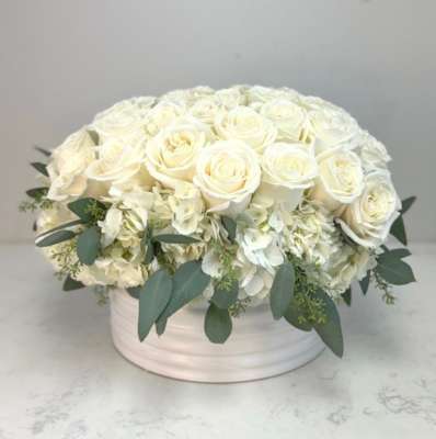 This arrangement of 4 dozen roses, hydrangea and seeded eucalyptus is in a white ceramic patterned container with a mat finish. If another color rose is preferred please specify in the space provided below.