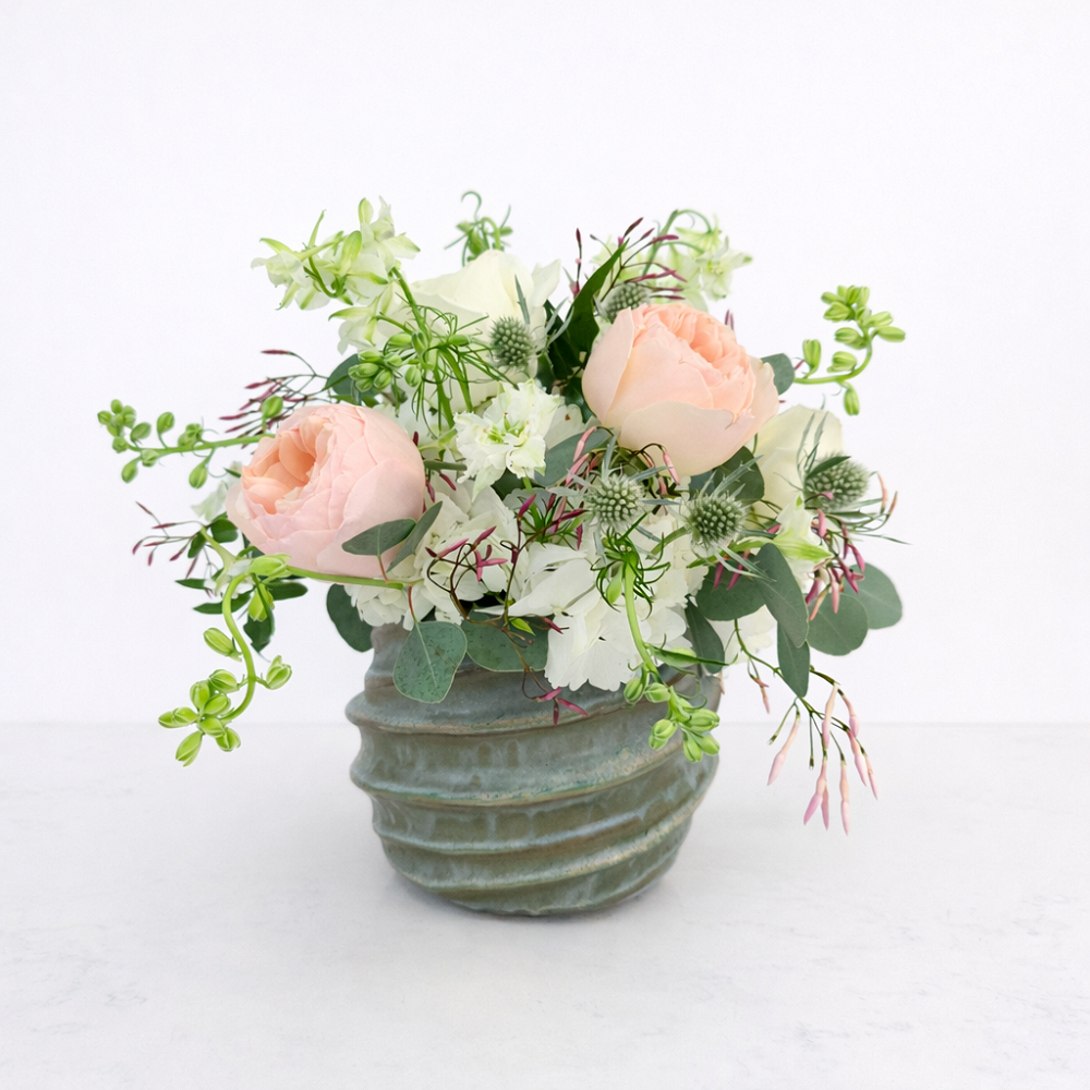 Peach garden roses, white blossoms, and seasonal greenery are gathered into this elegant spring garden-style arrangement. Designed in a textured artisan vase, it’s a timeless floral gift for spring occasions.