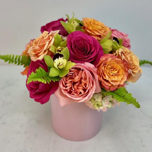 This arrangement is filled with beautiful roses accentuated with hydrangea and cymbidium orchids in a pale pink ceramic container.
