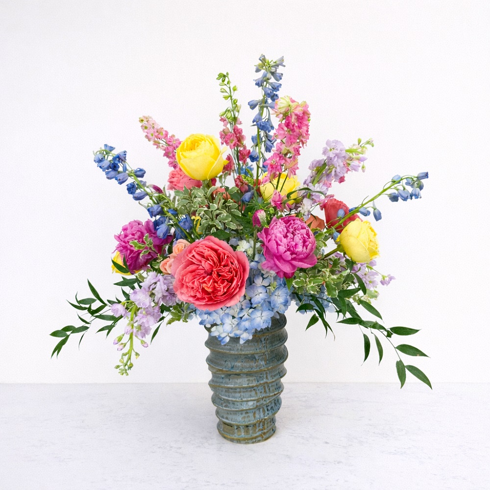 This statement piece features bright yellow and pink garden roses, delicate delphinium and larkspur, and trailing greenery, all arranged in an artisan ceramic vase. This arrangement is certain to make an impact in an entryway or as a heartfelt gift for a loved one.
